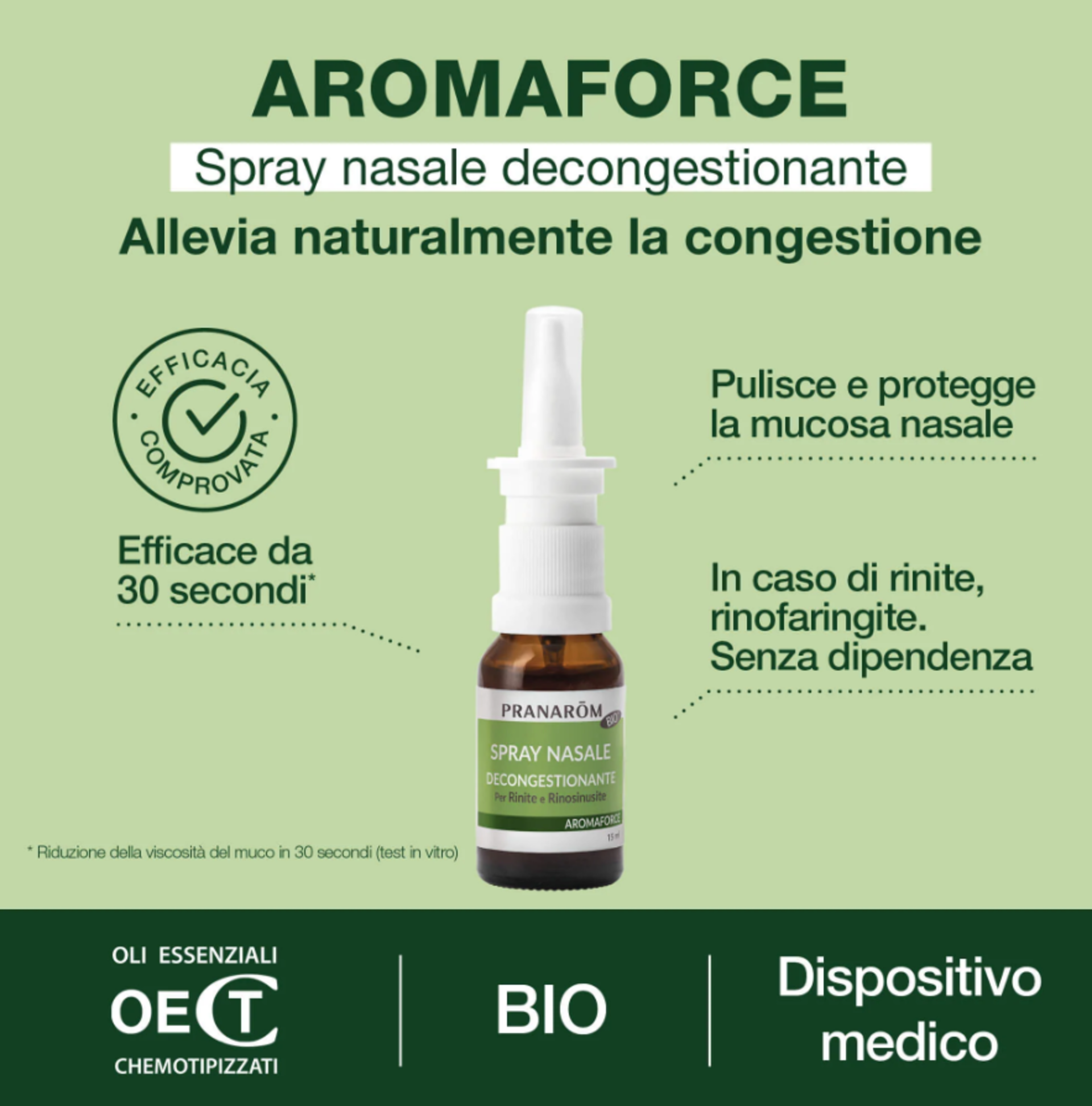 Lo spray nasale Aromaforce è una soluzione ipertonica che decongestiona il naso in 30 secondi.